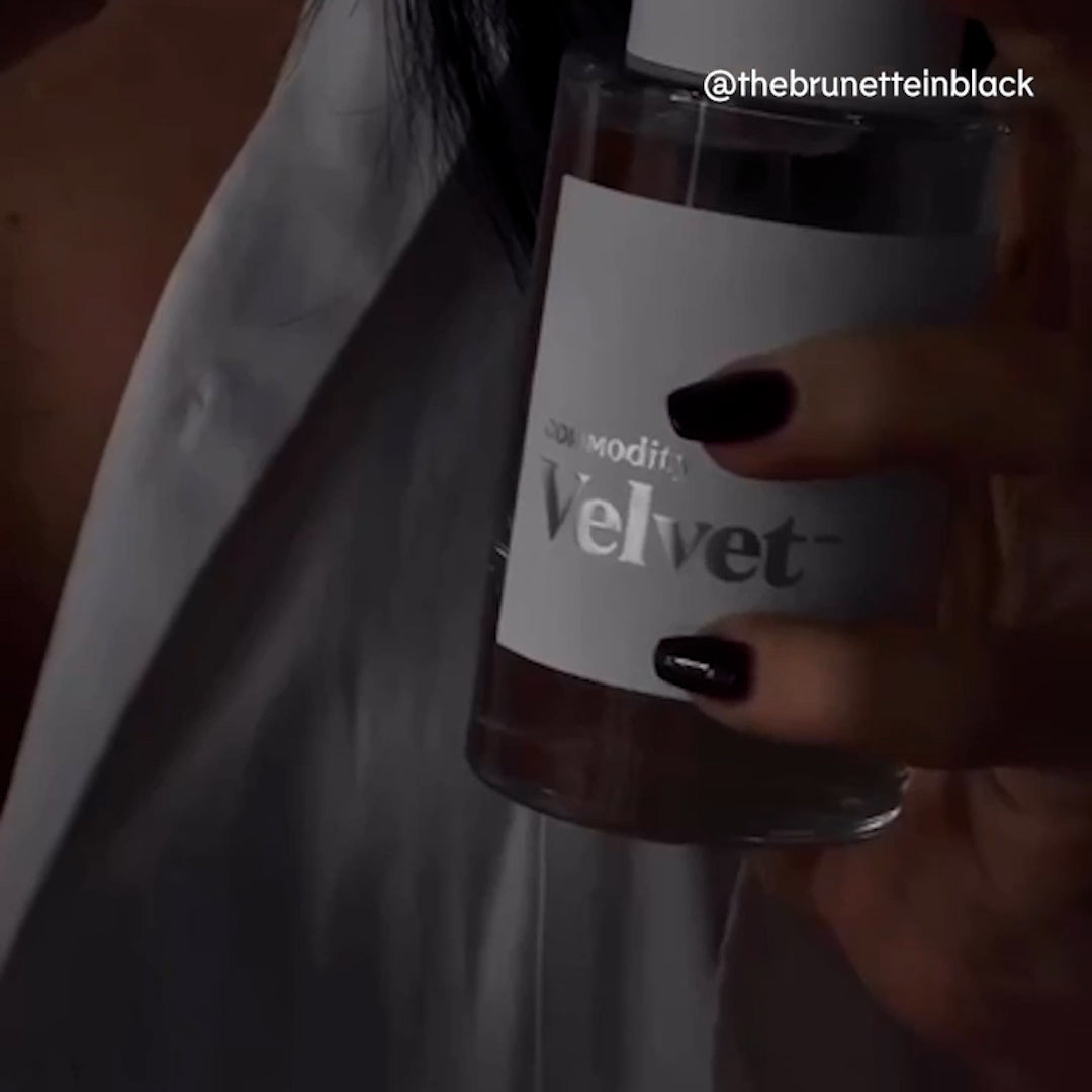 "För Commodity Velvet inspirerades jag av bilden av livfulla rosa turkiska rosenblad som försiktigt svävar över en mystisk, mörk bakgrund av varm vanilj och svart bärnsten med en utsökt touch av rostad mandel i luften. För Velvet Personal använde jag mig av rosa turkiska rosenblad som blandades med fräschör från kokosvatten och rik vanilj. Jag avslutade med varm vit skog medan jag tog bort den svarta ambern för att skapa en mjukare doftupplevelse."-Jerome Epinette