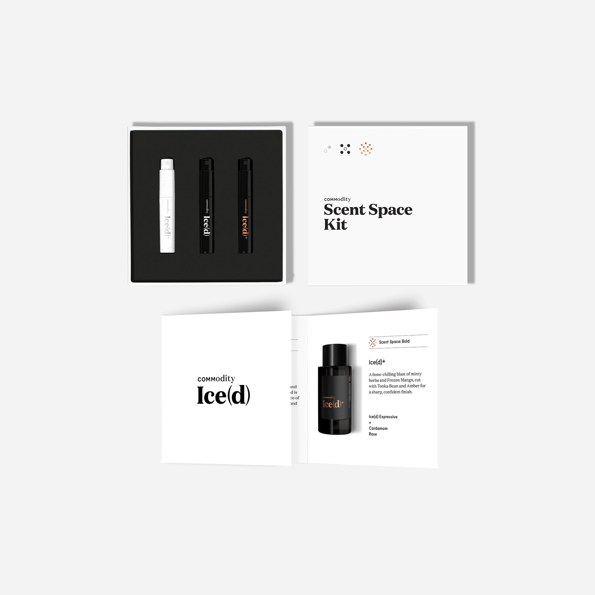 This kit includes Ice(d) in all 3 Scent Space versions: a closely-projecting Personal, noticeably unique Expressive, and a room-filling Bold version.